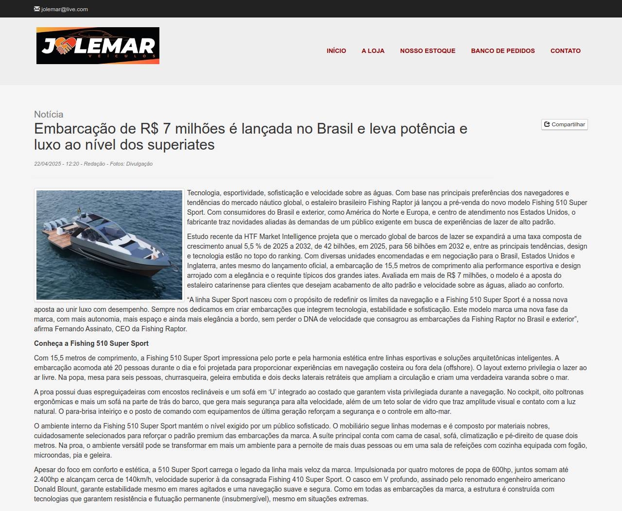 Notícia Embarcação de R$ 7 milhões é lançada no Brasil e leva potência e luxo ao nível dos superiates 22/04/2025 - 12:20 -