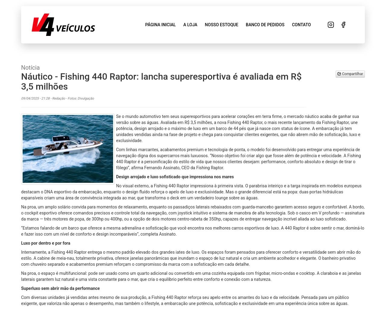 Notícia Náutico - Fishing 440 Raptor: lancha superesportiva é avaliada em R$ 3,5 milhões 09/04/2025 - 21:28 - Redação - Fo