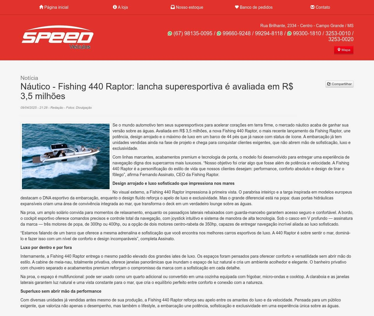 Notícia Náutico - Fishing 440 Raptor: lancha superesportiva é avaliada em R$ 3,5 milhões 09/04/2025 - 21:28 - Redação - Fo
