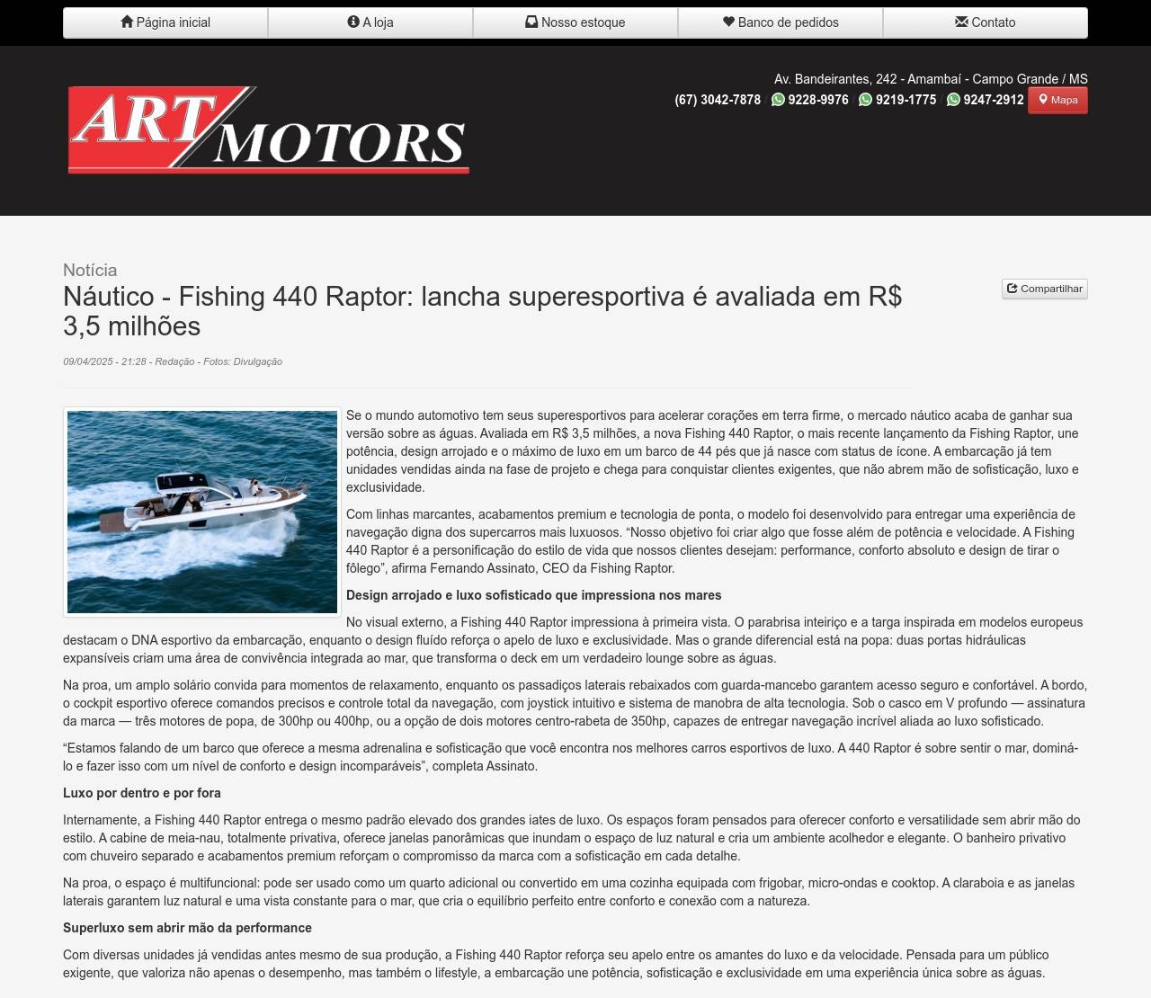 Notícia Náutico - Fishing 440 Raptor: lancha superesportiva é avaliada em R$ 3,5 milhões 09/04/2025 - 21:28 - Redação - Fo