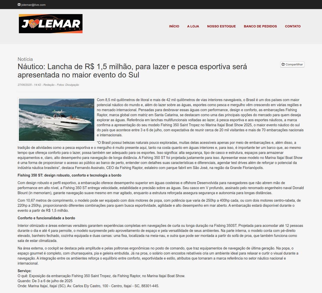 Notícia Náutico: Lancha de R$ 1,5 milhão, para lazer e pesca esportiva será apresentada no maior evento do Sul 27/06/2025