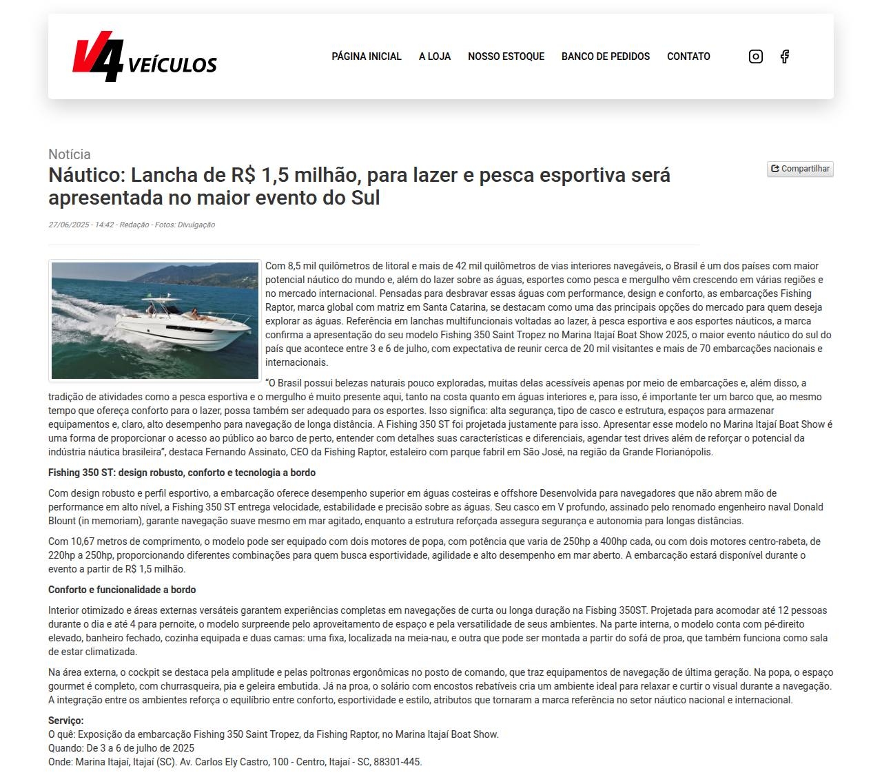 Notícia Náutico: Lancha de R$ 1,5 milhão, para lazer e pesca esportiva será apresentada no maior evento do Sul 27/06/2025
