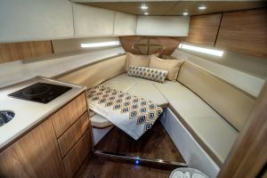 O interior da embarcação foi projetado para oferecer conforto e aproveitamento inteligente dos espaços. A cabine de proa reúne cozinha completa, sofá de apoio e mesa central rebatível, que permite transformar o ambiente em um segundo camarote para casais. Já a suíte principal, localizada à meia-nau, é considerada uma das maiores da categoria, com quase dois metros de largura, dimensões compatíveis com uma cama king size e pé-direito de dois metros. Ambientes bem iluminados por LED e janelas panorâmicas ampliam a sensação de amplitude e conexão com o mar. O barco conta ainda com banheiro com box fechado, ideal para uso diário e pernoite de até quatro pessoas.