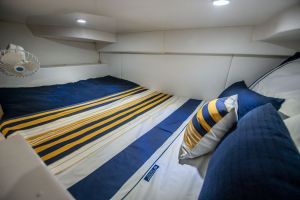 Interior otimizado e áreas externas versáteis garantem experiências completas em navegações de curta ou longa duração na Fisbing 350ST. Projetada para acomodar até 12 pessoas durante o dia e até 4 para pernoite, o modelo surpreende pelo aproveitamento de espaço e pela versatilidade de seus ambientes. Na parte interna, o modelo conta com pé-direito elevado, banheiro fechado, cozinha equipada e duas camas: uma fixa, localizada na meia-nau, e outra que pode ser montada a partir do sofá de proa, que também funciona como sala de estar climatizada.